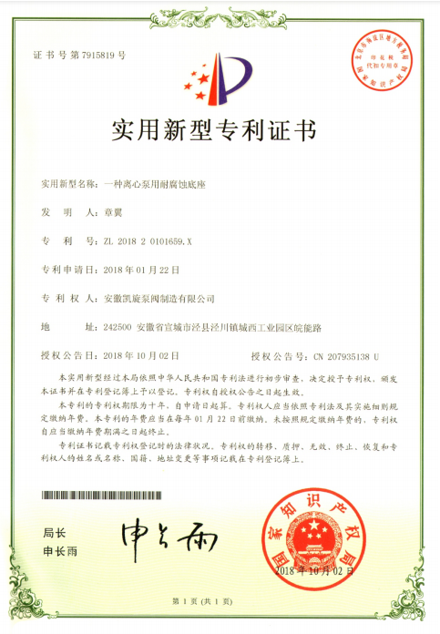 專利證書:一種離心泵用耐腐蝕底座
